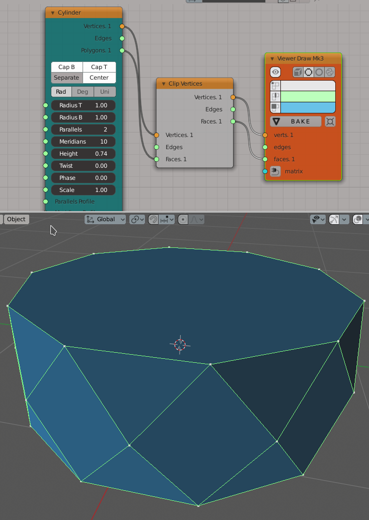 This node cuts (clips, truncates...) all vertices of original mesh, by cutting each edge in half and connecting centers of edges to create new faces.