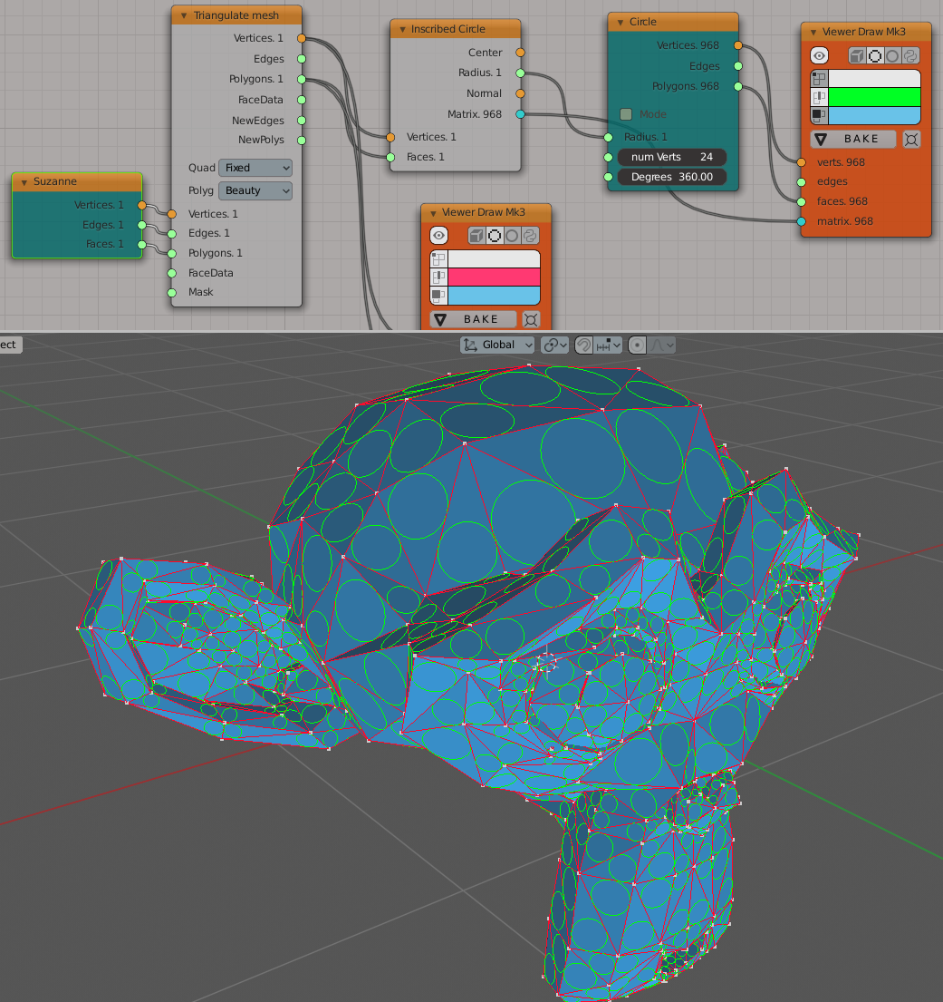 This node calculates the center and the radius of inscribed circle for triangluar faces. For non-tri faces, this node will either skip them, or give an error, depending on setting.